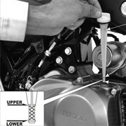 In order to check the level of the engine oil, the vehicle should be on main stand. Check the engine oil level using the dipstick. The engine oil level should be maintained between the upper and the lower level marks of the dipstick. In case it is needed, top up the engine oil up to the upper level on the dipstick.